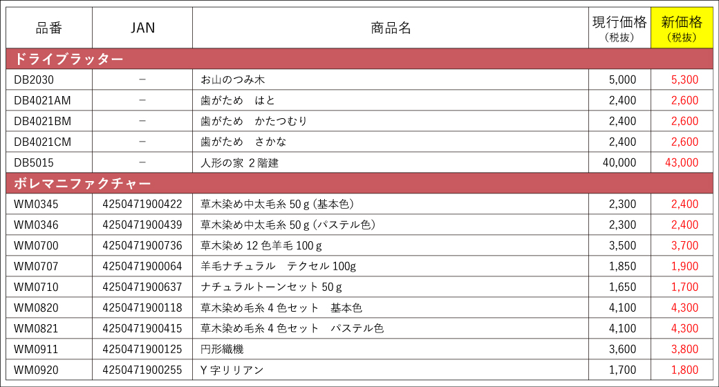 ▼価格改定商品一覧(ドライブラッター・ボレマニファクチャ―)